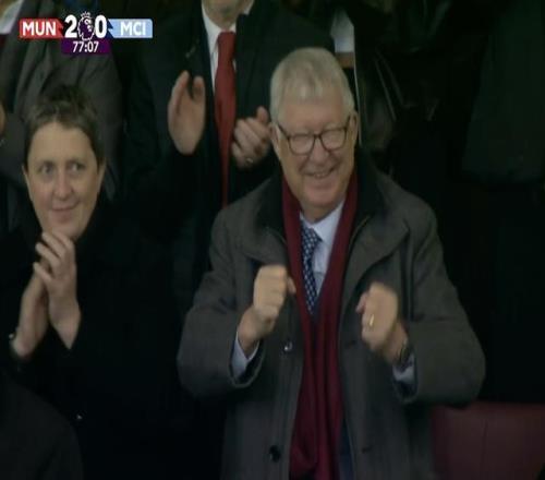 英超第22轮曼市德比,曼联主场对阵曼城,在曼联取得2-0领先后,红魔功勋主帅弗格森爵士在看台上握拳庆祝。